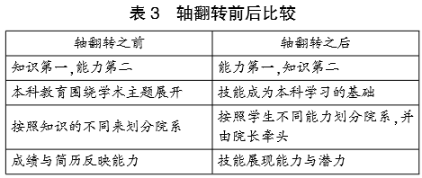 轴翻转的含义是要将“先知识后能力”反转为“先能力后知识”,能力成为斯坦福大学学生本科学习的基础。这就是说,改变传统大学中按照知识来划分不同院系归属的方法,按照学生的不同能力进行划分,重新建构院系。《斯坦福大学2025计划》提出,到2024年,斯坦福大学商学院将推出十个建立在本科生能力之上的教学中心,并分别任命中心负责人来负责开发交叉学科的课程,每个中心负责人都将成为斯坦福大学的组织结构及其架构的核心。这十个中心包括科学分析、定量推理、社会调查、道德推理、审美解读、沟通有效性等。在对学生的考察和考核方面,斯坦福大学也进行了改革。现在,学生的成绩单已经不再是一张回顾性的“大数据”记录——花了多少时间在哪个知识点上,而是一个实时、动态的“竞争力状态”清单,展示了学生正在学习什么、学会了什么、技能处于什么层级……通过这种独特的、展现“当下技能值”的方式,学生更有可能找到心仪的雇主;雇主借助这样的能力数据,也能更精准地遴选出与企业需求相匹配的候选人。届时,那些多才多艺和具有快速学习与适应能力的斯坦福大学毕业生,将更有可能被招募到行业前沿的公司和组织(见表3)。