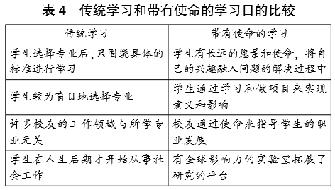 《斯坦福大学2025计划》之所以要推行“带着使命感去学习”,是为了帮助学生在校学习期间选择有意义的课程,并以此为基础,支撑起一段目标清晰的、纵贯毕业之后10~15年的职业生涯。如此,斯坦福大学的毕业生才有能力、有意识、有担当去领导有效的实践,以抵抗未来世界可能出现的一系列经济、政治、社会和技术以及目前未知领域的风险。使命感本身不是对职业的描绘,但它是驱动个人在职业生涯中追求卓越的“秘密武器”(见表4)。