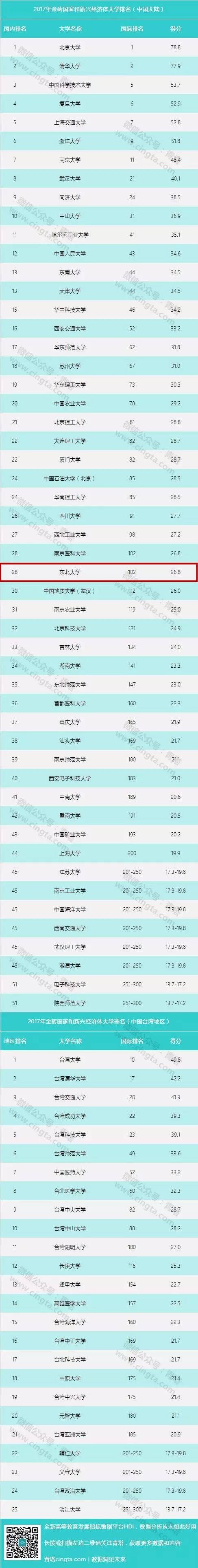 【2017年金砖国家和新兴经济体大学排行出炉】中国77所上榜高校中,东北大学位列中国大陆28名
