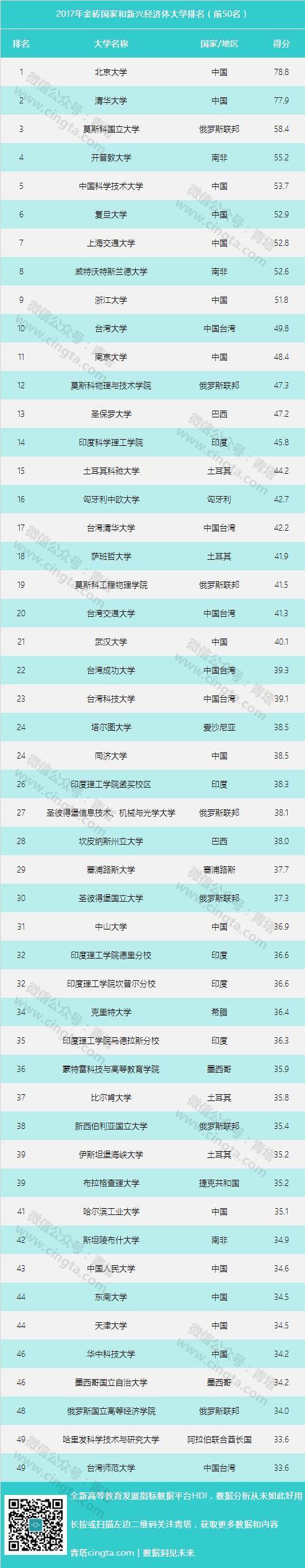 排名前十的高校共有7所中国高校。此外,俄罗斯的莫斯科国立大学、南非的开普敦大学和威特沃特斯兰德大学也都进入前十名。前50高校中,中国大陆和台湾高校表现也相当强势。下面来看看本次排名前50名高校的详细情况: