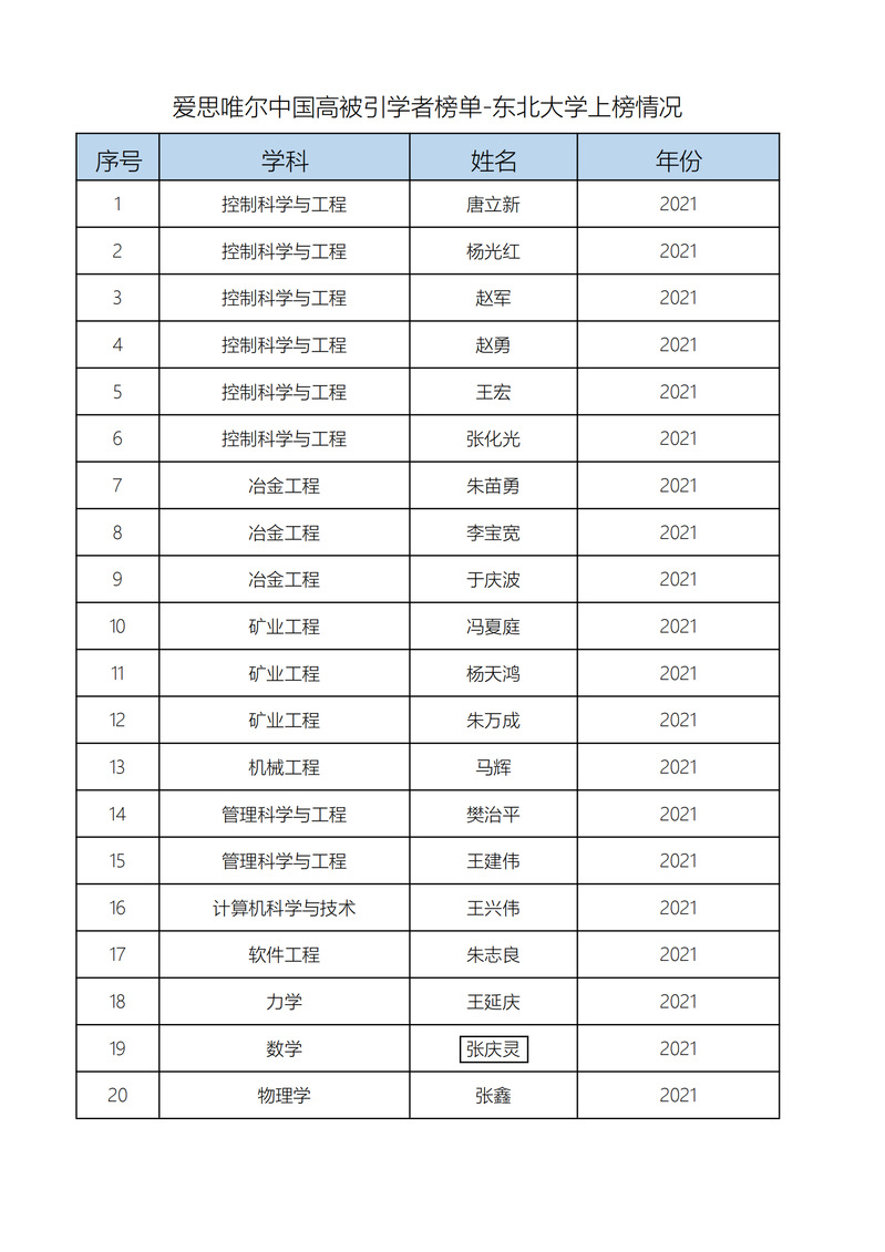 2022年4月,爱思唯尔(Elsevier)发布了2021“中国高被引学者”(Highly Cited Chinese Researchers)榜单。我校共有20名学者上榜。此榜单以全球权威的引文与索引数据库Scopus作为中国学者科研成果的统计来源,采用上海软科教育信息咨询有限公司开发的方法,分析中国学者的科研成果表现。自2015年首发,至2022年已是第八次发布,并受到国内外众多媒体和学者的高度关注。